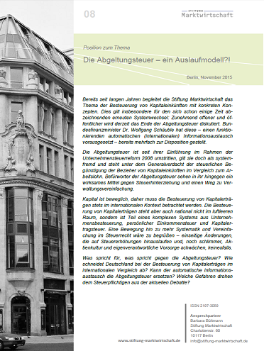 Die Besteuerung von Kapitalerträgen ist ein sensibles Thema: für die Bezieher von Kapitalerträgen, aber auch für diejenigen, die keine beziehen. Die Abgeltungsteuer galt bei Einführung als attraktive und moderne Besteuerung von Kapitalerträgen und sollte dem Schutz vor Kapitalflucht und zur Verfahrensvereinfachung dienen. Macht die geplante Einführung des automatischen Informationsaustauschs die Abgeltungsteuer obsolet? Wäre ein erneuter Systemwechsel wirklich sinnvoll und wenn ja, zu welchen Bedingungen?