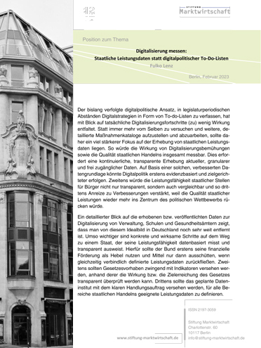 Ein detaillierter Blick auf die erhobenen bzw. veröffentlichten Daten zur Digitalisierung von Verwaltung, Schulen und Gesundheitsämtern zeigt, dass man von diesem Idealbild in Deutschland noch sehr weit entfernt ist. Umso wichtiger sind konkrete und wirksame Schritte auf dem Weg zu einem Staat, der seine Leistungsfähigkeit datenbasiert misst und transparent ausweist. Hierfür sollte der Bund erstens seine finanzielle Förderung als Hebel nutzen und Mittel nur dann ausschütten, wenn gleichzeitig verbindlich definierte Leistungsdaten zurückfließen. Zweitens sollten Gesetzesvorhaben zwingend mit Indikatoren versehen werden, anhand derer die Wirkung bzw. die Zielerreichung des Gesetzes transparent überprüft werden kann. Drittens sollte das geplante Dateninstitut mit dem klaren Handlungsauftrag versehen werden, für alle Bereiche staatlichen Handelns geeignete Leistungsdaten zu definieren.