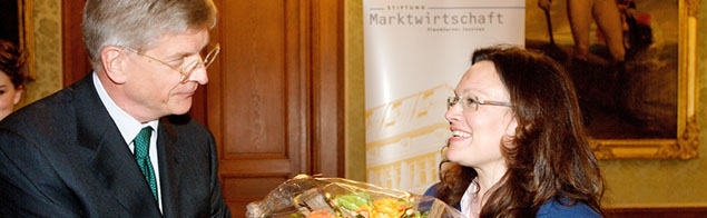 Den Höhepunkt des Abends stellte der Besuch der stellvertretenden SPD-Bundesvorsitzenden Andrea Nahles dar, die gleich zu Beginn ihrer Ansprache mit einer Recherche zum Kronberger Kreis aufwartete. Sie sei dabei auf die Formel „Mehr Mut zum Markt“ gestoßen, was ihrer Meinung nach „sehr gut in diese Zeit passe“. Daraus ergäbe sich ihrer Ansicht nach die Frage, wie der Markt wieder zum Funktionieren gebracht werden könne. Anschließend zitierte sie ein weiteres Mal die Gastgeber und bezog sich auf die Forderung nach mehr Freiheit, Verantwortung und Wettbewerb, wobei sie einen Schwerpunkt auf das Thema Verantwortung setzte. Nahles differenzierte zwischen individueller und gemeinsamer Verantwortung, bei der sie den Begriff der „organisierten Verantwortungslosigkeit“ herausstellte. Hier könne sie nicht einen einzigen Schuldigen ausmachen, sondern vielmehr handele es sich um das „Zusammentreffen von finanzwirtschaftlichen Ritualen und Gewohnheiten.“