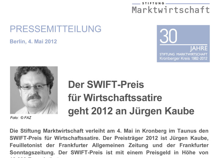 Die Stiftung Marktwirtschaft verleiht am 4. Mai in Kronberg im Taunus den SWIFT-Preis für Wirtschaftssatire. Der Preisträger 2012 ist Jürgen Kaube, Feuilletonist der Frankfurter Allgemeinen Zeitung und der Frankfurter Sonntagszeitung. Der SWIFT-Preis ist mit einem Preisgeld in Höhe von 10.000 Euro dotiert...