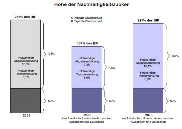 Die neuesten Berechnungen der Generationenbilanz zeigen, dass die Fiskalpolitik der Bundesregierung nach wie vor nicht nachhaltig ist ñ und das trotz erfreulich hoher Mehreinnahmen im Staatshaushalt als Folge des konjunkturell bedingten Aufschwungs. Die sogenannte Nachhaltigkeitsl¸cke ist nach den neuesten Daten zwar geschrumpft und liegt bei Ñnurì noch knapp 4 Billionen Euro bzw. 168 % des BIP. Insbesondere in den Sozialversicherungssystemen (Renten-, Kranken-, Pflegeversicherungen und Pensionslasten) sind jedoch nur geringe Verbesserungen zu beobachten. ÑDie Chance, nachhaltige Reformmaflnahmen zur Bew‰ltigung der demografischen Herausforderungen umzusetzen, wurde nicht genutzt,ì res¸miert Prof. Dr. Bernd Raffelh¸schen, Vorstandsmitglied der Stiftung Marktwirtschaft und Leiter des Forschungszentrums Generationenvertr‰ge an der Albert-Ludwigs-Universit‰t Freiburg auf der Pressekonferenz der Stiftung Marktwirtschaft...