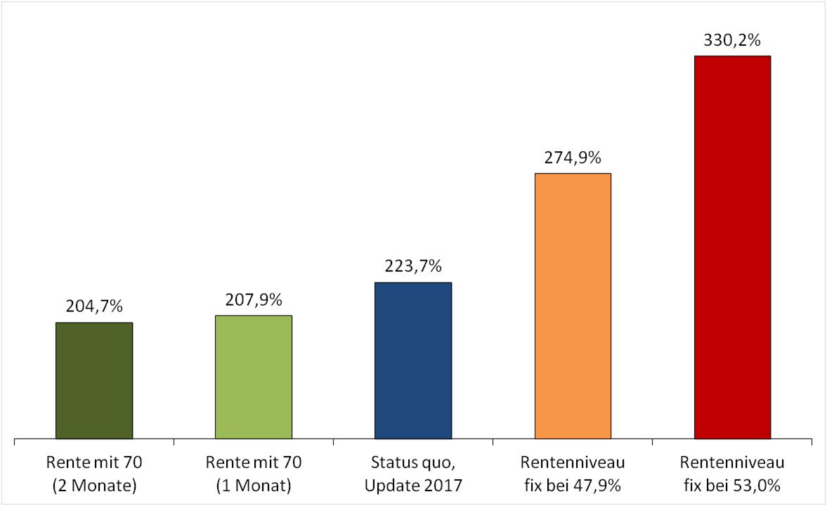 Die aktuellen Ergebnisse der Generationenbilanz zeigen eine leichte Verbesserung der deutschen Gesamtverschuldung (Nachhaltigkeitslücke) im Vergleich zum Vorjahr. Die Chance für einen deutlicheren Schuldenabbau wurde allerdings vertan. Steuer- und Beitragseinnahmen in Rekordhöhe verleiten die Politik im Wahljahr ein weiteres Mal zu vollmundigen Versprechungen, zum Beispiel bei der Rente. Dies könnte künftige Generationen teuer zu stehen kommen. Hinzu treten drohende Mehrbelastungen im Falle einer Zinswende. Allein im Bundeshaushalt wäre mit langfristigen Mehrkosten von bis zu 1,4 Bio. Euro zu rechnen.