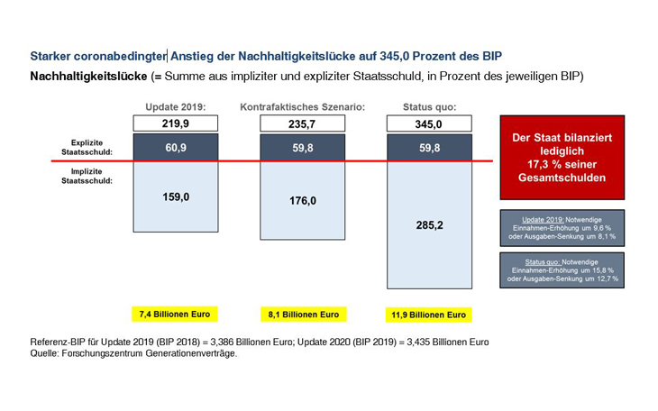 Die Corona-Pandemie und der resultierende weltweite Wirtschaftseinbruch führen zu einer deutlichen Verschlechterung der Nachhaltigkeit der öffentlichen Finanzen in Deutschland. Aktuell liegt die Nachhaltigkeitslücke aus expliziten und impliziten Staatsschulden in einem mittleren Szenario bei 345,0 Prozent des BIP. Im Vergleich zum Vorjahreswert von 219,9 Prozent des BIP ist das ein Anstieg um 125,1 Prozentpunkte. Zu diesen Ergebnissen kommen die jüngsten Berechnungen der Stiftung Marktwirtschaft und des Forschungszentrums Generationenverträge der Albert-Ludwigs-Universität Freiburg zur deutschen Generationenbilanz. In absoluten Zahlen entspricht die Nachhaltigkeitslücke einem Gesamtschuldenstand der öffentlichen Hand von 11,9 Billionen Euro. Der deutlich größere Teil – rund vier Fünftel – entfällt dabei auf die implizite, d.h. heute noch nicht direkt sichtbare, Staatsschuld. Diese beträgt 285,2 Prozent des BIP (9,8 Billionen Euro). Dahinter verbergen sich alle durch das heutige Steuer- und Abgabenniveau nicht gedeckten staatlichen Leistungsversprechen für die Zukunft, nicht zuletzt diejenigen der Sozialversicherungen.