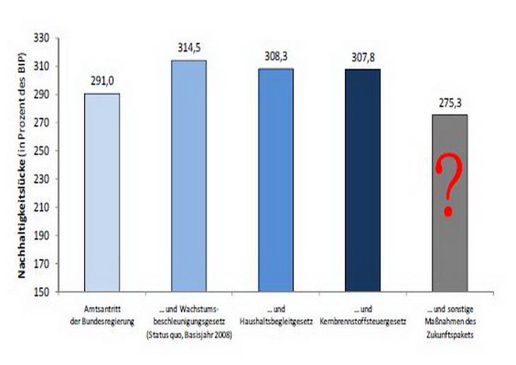 Nach neuesten Berechnungen der Stiftung Marktwirtschaft und des Forschungszentrums Generationenverträge hat das erste Jahr der schwarz-gelben Bundesregierung zu keiner Verbesserung der Tragfähigkeit der öffentlichen Haushalte geführt. Im Gegenteil: Im Vergleich zu der von der Großen Koalition „geerbten“ Nachhaltigkeitslücke in Höhe von 291 Prozent des Bruttoinlandsprodukts (BIP) ist die Nachhaltigkeitslücke aktuell sogar auf 308 Prozent des BIP gestiegen, das entspricht dem dreifachen Umfang der Wirtschaftsleistung Deutschlands oder 7,4 Billionen Euro. Allerdings könnte die konsequente Umsetzung der noch offenen Bausteine des Zukunftspakets sowie der Gesundheitsreform eine erste Verbesserung bringen. Dazu müsste die Regierungskoalition auch auf der Ausgabenseite mutiger reformieren.