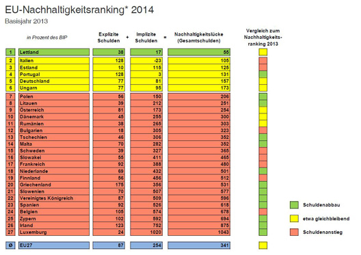 Das EU-Nachhaltigkeitsranking basiert auf einer ehrlichen Berechnung der Schuldenlast, da auch absehbare zukünftige Defizite der öffentlichen Haushalte (implizite Schulden) bzw. nach geltender Gesetzeslage zwingende Ausgaben mitberücksichtigt werden, denen keine Reserven gegenüberstehen (z.B. Beamten­pensionen).