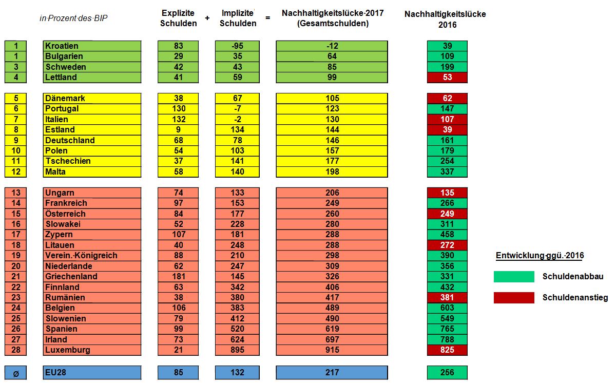 Schlusslicht des Rankings 2017 ist Luxemburg, dessen Nachhaltigkeitslücke um 90 Prozentpunkte steigt und so mit Schulden in neunfacher Höhe seiner ausgewiesenen Wirtschaftsleistung konfrontiert ist. Auch in Irland, Slowenien und Belgien führt der Einfluss der demografischen Alterung und des damit einhergehenden Anstiegs der öffentlichen Ausgaben für Renten, Gesundheits- und Pflegeleistungen zu hohen impliziten Schuldenständen. In Spanien, Rumänien und Frankreich ist hingegen die derzeitige Haushaltspolitik Grund der hohen Schuldenstände. Hier müssen dringend Konsolidierungsmaßnahmen ergriffen werden.