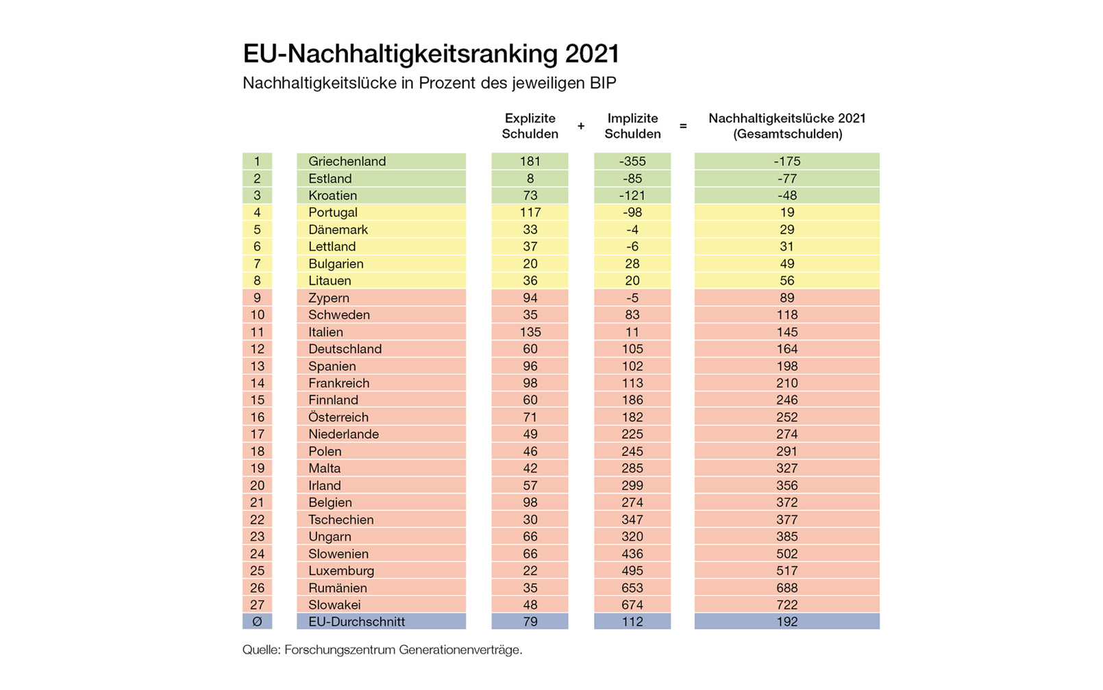 Das EU-Nachhaltigkeitsranking 2021 der Stiftung Marktwirtschaft und des Forschungszentrums Generationenverträge stellt eine umfassende Betrachtung der gesamten staatlichen Schuldenlast dar. Neben den explizit ausgewiesenen, sichtbaren Staatsschulden berücksichtigt es auch absehbare zukünftige Defizite der öffentlichen Haushalte (implizite Schulden), die vor allem aus einem überproportionalen Anstieg der altersabhängigen Ausgaben resultieren, denen weder ausreichende Einnahmenzuwächse noch finanzielle Reserven gegenüberstehen. Datengrundlage der Berechnungen sind der aktuelle Alterungsbericht der Europäischen Kommission 2021 sowie die wirtschaftliche Frühjahrs- und Sommerprognose der Europäischen Kommission.