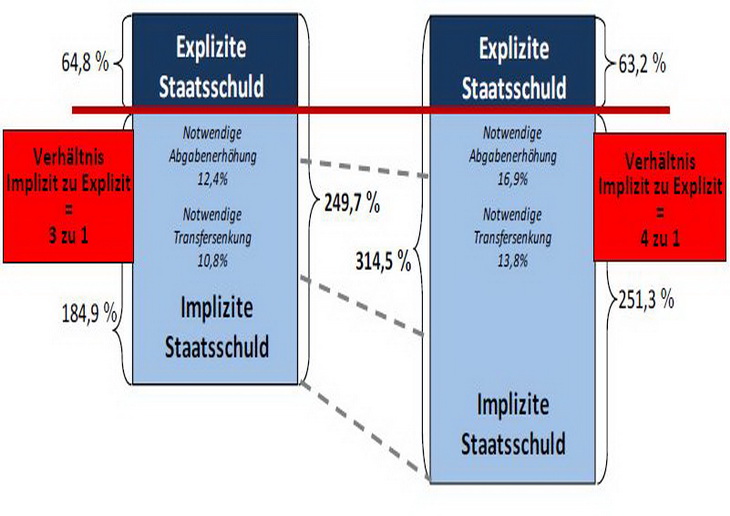 Die Nachhaltigkeitslücke aus expliziten und impliziten Staatsschulden beläuft sich nachneuesten Berechnungen der Stiftung Marktwirtschaft und des Forschungszentrums Generationenverträgeauf knapp 8 Billionen Euro. Konsolidierungsfortschritte vergangener Jahrewurden durch die Wirtschaftskrise sowie wirtschaftspolitische Konjunktur- und Wachstumsprogrammeweitgehend zunichte gemacht – die Gesamtschuldenlast liegt fast wieder auf demNiveau des Jahres 2004. Darüber hinaus zeigen die Berechnungen zum ThemenschwerpunktGesundheit, welche Wirkung unterschiedliche Gesundheitsprämienmodelle in der GesetzlichenKrankenversicherung auf die Nachhaltigkeitslücke haben und welche zusätzlichen Steuermittelzur Finanzierung des notwendigen Sozialausgleichs benötigt werden.