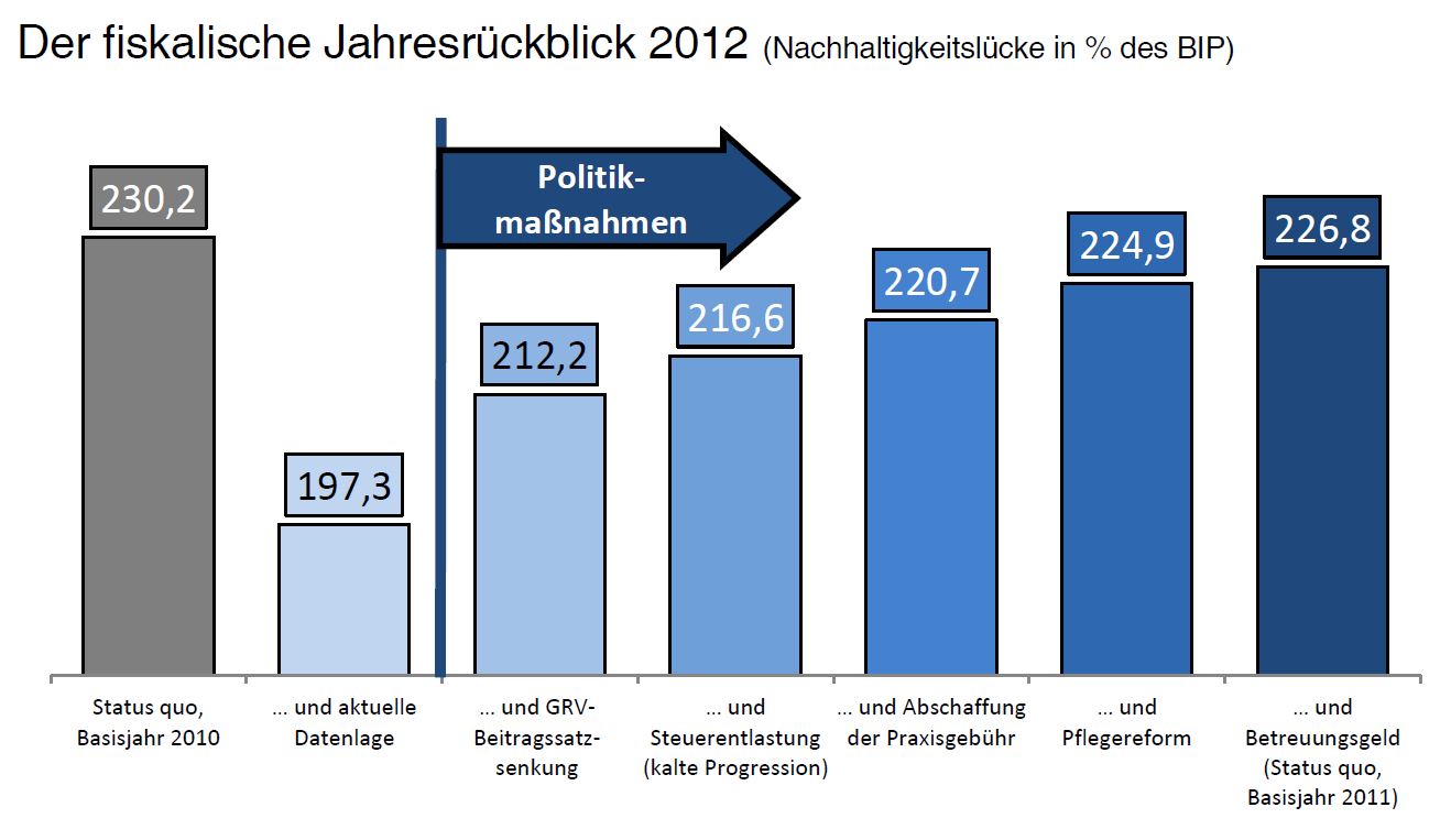 Die neuesten Ergebnisse der Generationenbilanz zeigen eine Stagnation der deutschen Gesamtverschuldung (Nachhaltigkeitslücke) im Vergleich zum Vorjahr. Die Chance eines deutlichen Schuldenabbaus, die in den letzten Monaten bestanden hätte, wurde von der Bundesregierung durch ökonomisch fragwürdige und kostspielige „Geschenke“ – Betreuungsgeld, Abschaffung der Praxisgebühr und Pflegereform – zunichte gemacht. Eine Analyse der Wahlprogramme im Vorfeld der Bundestagswahl zeigt zudem, dass eine Fortsetzung dieser problematischen Politik droht, egal wie sich die neue Bundesregierung zusammensetzt.