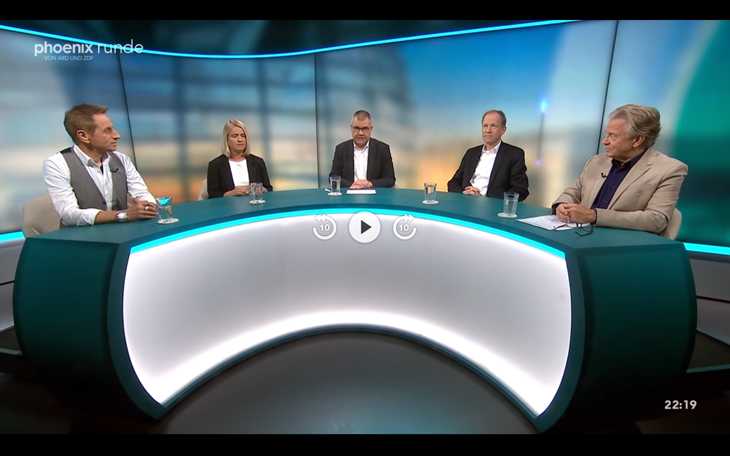 Prof. Dr. Michael Eilfort, Vorstand der Stiftung Marktwirtschaft, diskutierte am 31.08.2022 mit Verena Bentele (Sozialverband VDK Deutschland), Thomas de Vachroi (Armutsbeauftragter Ev. Kirchenkreis Neukölln) und Daniel Goffart (Wirtschaftswoche) unter der Moderation von Alexander Kähler in der phoenix runde über das Thema "Sorge vor dem Winter Wer wird wie entlastet?“