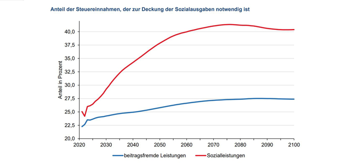 „Aufgrund der Bevölkerungsalterung wird das heutige Niveau der steuerfinanzierten und versicherungsfremden Sozialleistungen nur dann unter Beibehaltung der aktuellen Steuersätze dauerhaft finanzierbar sein, wenn der Staatshaushalt immer stärker belastet wird“, warnt Raffelhüschen: „Schon heute beträgt der Anteil der gesamten Steuereinnahmen von Bund, Ländern und Gemeinden, der jährlich allein für die Finanzierung beitragsfremder Sozialleistungen aufgewendet werden muss, rund 22,3 Prozent. Im Jahr 2040 werden wir mehr als ein Viertel der gesamten Steuereinnahmen benötigen, um die Ausgaben bei gleichem Leistungsniveau zu decken“ (vgl. Abbildung). Der Steueranteil, der zur langfristigen Finanzierung aller Sozialleistungen notwendig ist, fällt naturgemäß noch höher aus und wird unter Beibehaltung der heutigen Rahmenbedingungen von derzeit 25,1 Prozent bis 2060 auf 40 Prozent anwachsen.