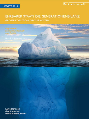 Deutschlands Nachhaltigkeitslücke aus expliziten und impliziten Staatsschulden ist auf 200 % des Bruttoinlandsprodukts (BIP) gesunken (Update 2017: 224 % des BIP). In absoluten Zahlen entspricht dies einem Gesamtschuldenstand der öffentlichen Hand von 6,3 Billionen Euro. Der größere Teil entfällt dabei nach wie vor auf die implizite, d.h. heute noch nicht direkt sichtbare Staatsschuld. Sie beträgt 132 % des BIP (umgerechnet 4,1 Billionen Euro). Dahinter verbergen sich alle durch das heutige Steuer- und Abgabenniveau nicht gedeckten staatlichen Leistungsversprechen für die Zukunft, insbesondere der Sozialversicherungen. Mit 68 % des BIP entfällt der kleinere Teil der Nachhaltigkeitslücke auf die explizite, schon heute sichtbare und offiziell ausgewiesene Staatsverschuldung. Zu diesen Ergebnissen kommt die aktuelle Generationenbilanz für Deutschland, die von Prof. Dr. Bernd Raffelhüschen, Vorstandsmitglied der Stiftung Marktwirtschaft und Leiter des Forschungszentrums Generationenverträge der Albert-Ludwigs-Universität Freiburg, am 19. Juni 2018 in Berlin im Rahmen eines Pressegesprächs vorgestellt wurde.