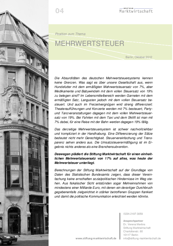 Der ermäßigte Mehrwertsteuersatz ist eine Branchensubvention und hat mit sozialer Gerechtigkeit in seiner jetzigen Form wenig zu tun. Deshalb tritt die Stiftung Marktwirtschaft für einen einheitlichen Mehrwertsteuersatz von 17% ein. Eine Differenzierung der Mehrwertsteuersätze bedeutet entgegen der landläufigen Meinung nicht mehr Gerechtigkeit, sondern trägt sogar zu Intransparenz und Ineffizienz bei.