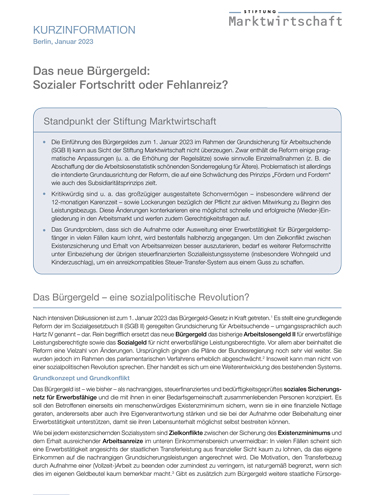 Die Einführung des Bürgergeldes zum 1. Januar 2023 im Rahmen der Grundsicherung für Arbeitsuchende (SGB II) kann aus Sicht der Stiftung Marktwirtschaft nicht überzeugen. Zwar enthält die Reform einige pragmatische Anpassungen (u. a. die Erhöhung der Regelsätze) sowie sinnvolle Einzelmaßnahmen (z. B. die Abschaffung der die Arbeitslosenstatistik schönenden Sonderregelung für Ältere). Problematisch ist allerdings die intendierte Grundausrichtung der Reform, die auf eine Schwächung des Prinzips „Fördern und Fordern“ wie auch des Subsidiaritätsprinzips zielt.