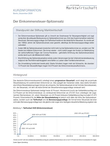 Der Einkommensteuer-Spitzensatz gilt zu Unrecht als Gradmesser für Steuergerechtigkeit und sagt wenig über die adäquate Besteuerung von Spitzeneinkommen aus. Erst das Zusammenwirken zwischen Steuersatz, Bemessungsgrundlage und Tarifverlauf bestimmt die tatsächliche Steuerlast. So wurde seit den 1990er Jahren der Spitzensteuersatz zwar gesenkt, allerdings die Bemessungsgrundlage weiter verbreitert. Zudem fällt der Spitzensteuersatz inzwischen nicht mehr nur bei Spitzeneinkommen an, sondern zum Teil bereits bei mittleren Einkommen. Die immer wieder – nicht zuletzt wegen der Kosten zur Bekämpfung der (wirtschaftlichen) Folgen der Corona-Pandemie – geforderte Erhöhung des Spitzensteuersatzes würde damit auch die Mittelschicht treffen. Eine Erhöhung des Spitzensteuersatzes würde zudem Verzerrungen bei der Unternehmensbesteuerung aufgrund der Rechtsformabhängigkeit verschärfen zu Lasten vieler Familienunternehmen. Die Umverteilung funktioniert bereits jetzt: Starke Schultern tragen mehr als Schwache, die obersten 10 Prozent der Steuerpflichtigen tragen 54,8 Prozent des Einkommensteueraufkommens.