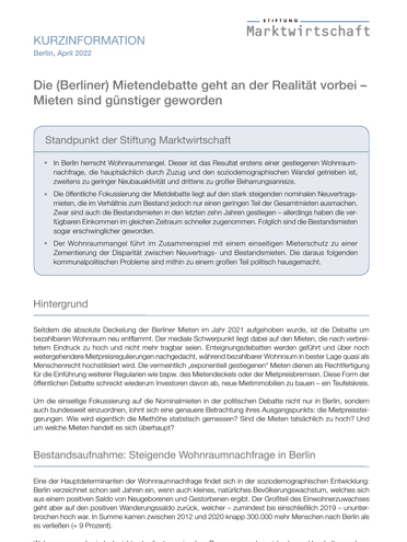 Berlin herrscht Wohnraummangel. Dieser ist das Resultat erstens einer gestiegenen Wohnraumnachfrage, die hauptsächlich durch Zuzug und den soziodemographischen Wandel getrieben ist, zweitens zu geringer Neubauaktivität und drittens zu großer Beharrungsanreize. Die öffentliche Fokussierung der Mietdebatte liegt auf den stark steigenden nominalen Neuvertragsmieten, die im Verhältnis zum Bestand jedoch nur einen geringen Teil der Gesamtmieten ausmachen. Zwar sind auch die Bestandsmieten in den letzten zehn Jahren gestiegen – allerdings haben die verfügbaren Einkommen im gleichen Zeitraum schneller zugenommen. Folglich sind die Bestandsmieten sogar erschwinglicher geworden. Der Wohnraummangel führt im Zusammenspiel mit einem einseitigen Mieterschutz zu einer Zementierung der Disparität zwischen Neuvertrags- und Bestandsmieten. Die daraus folgenden kommunalpolitischen Probleme sind mithin zu einem großen Teil politisch hausgemacht.