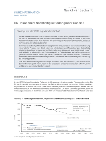 Mit der Taxonomie entsteht in der Europäischen Union (EU) ein umfangreiches Klassifikationssystem, das darüber entscheiden soll, wann eine wirtschaftliche Aktivität als nachhaltig anzusehen ist und wohin Kapitalströme fließen sollen. Auch wenn mit der Taxonomie gute Absichten verbunden sind, ist sie aus mehreren Gründen kritisch zu bewerten. Jeder noch so akribisch geführte Kriterienkatalog kann mit der dynamischen und komplexen Entwicklung wirtschaftlicher Prozesse nicht Schritt halten und erfordert permanent Neujustierungen, die langfristig orientierten Investitionen entgegenstehen. Die Anmaßung von Wissen, die gesamte Wirtschaft in „gut“ und „schlecht“ einteilen zu können, führt unweigerlich zu Fehlallokationen und zu Stigmatisierungen ganzer Wirtschaftsbereiche, die dem geforderten Transformationsprozess eher schaden. Es entstehen zudem erhebliche bürokratische Belastungen für die Unternehmen durch die Erhebung und Auswertung der notwendigen Daten. Statt mehr Klimaschutz dirigistisch erzwingen zu wollen, sollte die EU den CO2-Preis stärker in das Zentrum ihrer Klimapolitik stellen, indem sie das Europäische Emissionshandelssystem auf mehr Länder und Sektoren ausweitet und global verzahnt.