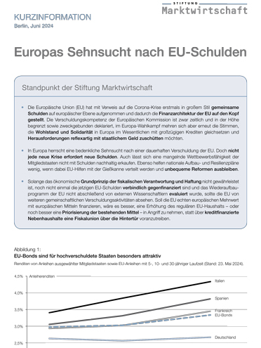 Die Europäische Union (EU) hat mit Verweis auf die Corona-Krise erstmals in großem Stil gemeinsame Schulden auf europäischer Ebene aufgenommen und dadurch die Finanzarchitektur der EU auf den Kopf gestellt. Die Verschuldungskompetenz der Europäischen Kommission ist zwar zeitlich und in der Höhe begrenzt sowie zweckgebunden deklariert, im Europa-Wahlkampf mehren sich aber erneut die Stimmen, die Wohlstand und Solidarität in Europa im Wesentlichen mit großzügigen Krediten gleichsetzen und Herausforderungen reflexartig mit staatlichem Geld zuschütten möchten.