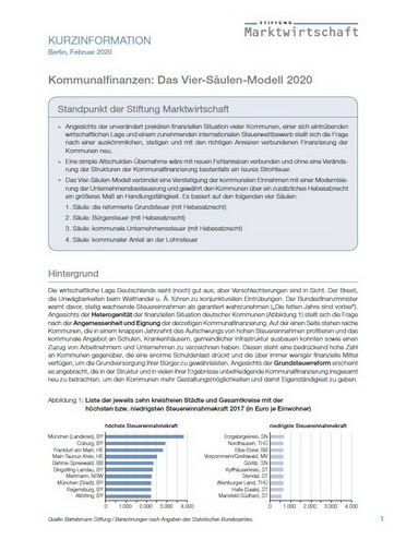 Das Vier-Säulen-Modell, das in dieser Kurzinformation dargestellt wird, verbindet eine Verstetigung der kommunalen Einnahmen mit einer Modernisierung der Unternehmensbesteuerung und gewährt den Kommunen über ein zusätzliches Hebesatzrecht ein größeres Maß an Handlungsfähigkeit. Es basiert auf den folgenden vier Säulen: