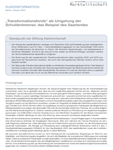 Der Antrag des saarländischen Landtags vom Dezember 2022 auf Feststellung einer außergewöhnlichen Notsituation nach § 2 Abs. 1 Haushaltstabilisierungsgesetz für das Haushaltsjahr 2022 droht die Schuldenbremse ad absurdum zu führen. Mit ähnlichen Begründungen, wie beispielsweise in Nordrhein-Westfalen, könnte in der Zukunft immer wieder auf ähnliche Notlagen verwiesen werden, um die Schuldenbremse dauerhaft zu umgehen. Die Rechnung für den Saarländischen Transformationsfonds sollen zwischen 2035 und 2070 ausgerechnet die Generationen bezahlen, die durch den demografischen Wandel ohnehin schon stark belastet werden. Die Tilgung des Transformationsfonds dürfte zu erheblichen Haushaltsengpässen führen. Das Saarland hat heute aufgrund der schwebenden Versorgungsverpflichtungen der Beamtenpensionen bereits die höchsten impliziten Schulden aller Bundesländer. Sie werden im Laufe der nächsten Jahre zu expliziten Schulden und damit den Druck auf die öffentlichen Haushalte auch sichtbar erhöhen.