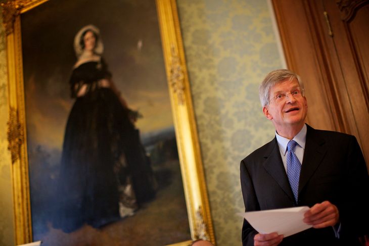 Der Stiftungsratsvorsitzende Prof. Dr. Theo Siegert hält die Laudatio auf den Preisträger, der – dem Namensgeber Jonathan Swift gleich – die Satire als Genre für zeitgenössische Betrachtungen nutzt:
