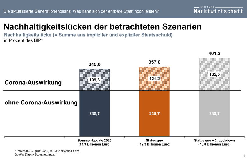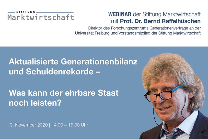 Diese und weitere Fragen thematisierte die Stiftung Marktwirtschaft am 19. November 2020 im Rahmen eines Webinars mit Prof. Dr. Bernd Raffelhüschen, Vorstandsmitglied der Stiftung Marktwirtschaft und zugleich Leiter des Forschungszentrums Generationenverträge an der Albert-Ludwigs-Universität Freiburg. In seiner Präsentation erläuterte Raffelhüschen zunächst den Grundgedanken und die Methodik der Generationenbilanzierung. Bei diesem rechentechnisch aufwendigen Instrument zur Projektion und Analyse der zukünftigen fiskalischen Entwicklung handele es sich de facto um eine dynamisierte volkswirtschaftliche Gesamtrechnung. Als zentraler Indikator zur Beurteilung der Staatsfinanzen fungiere die sogenannte Nachhaltigkeitslücke, die neben den heute bereits sichtbaren expliziten Schulden aus der Vergangenheit auch die sogenannten impliziten – d.h. die bei Fortführung des Status quo erst in Zukunft entstehenden – Schulden berücksichtige. Somit bilde die Nachhaltigkeitslücke die tatsächliche staatliche Gesamtverschuldung unter Berücksichtigung der projizierten zukünftigen Haushaltsüberschüsse und -defizite ab. Von einer fiskalisch nachhaltigen Situation, in der die Nachhaltigkeitslücke den Wert Null aufweise, sei der deutsche Staat weit entfernt, erläuterte Raffelhüschen und verwies auf die aktuelle Nachhaltigkeitslücke von mindestens 357 Prozent des BIP. Berücksichtige man zusätzlich noch die Auswirkungen des zweiten Lockdowns seit Herbst 2020, müsse sogar von einer staatlichen Gesamtverschuldung von rund 400 Prozent des BIP ausgegangen werden. Die Corona-Pandemie und der durch sie verursachte Wachstumseinbruch führten zu einbrechenden Staatseinnahmen bei gleichzeitig stark steigenden Ausgaben und verschlechterten dementsprechend die Verschuldungssituation erheblich. Vor allem die implizite Verschuldung sei dadurch um mehr als ein Bruttoinlandsprodukt gestiegen. Raffelhüschen warnte, dass die – heute noch – impliziten Schulden im Zeitablauf sukzessive zu expliziten Schulden würden, wenn man so weitermache wie bisher, und verwies auf die dann zu erwartenden Verwerfungen in der Geldpolitik und auf den Finanzmärkten.