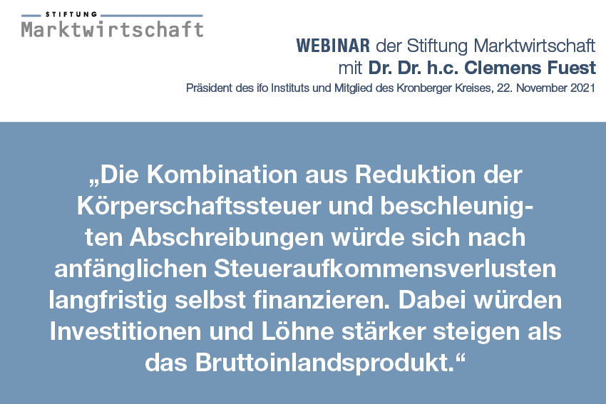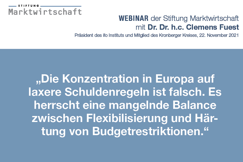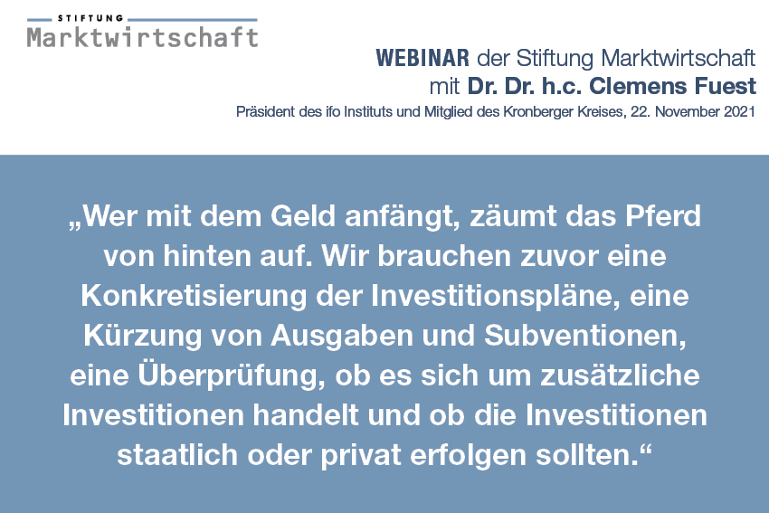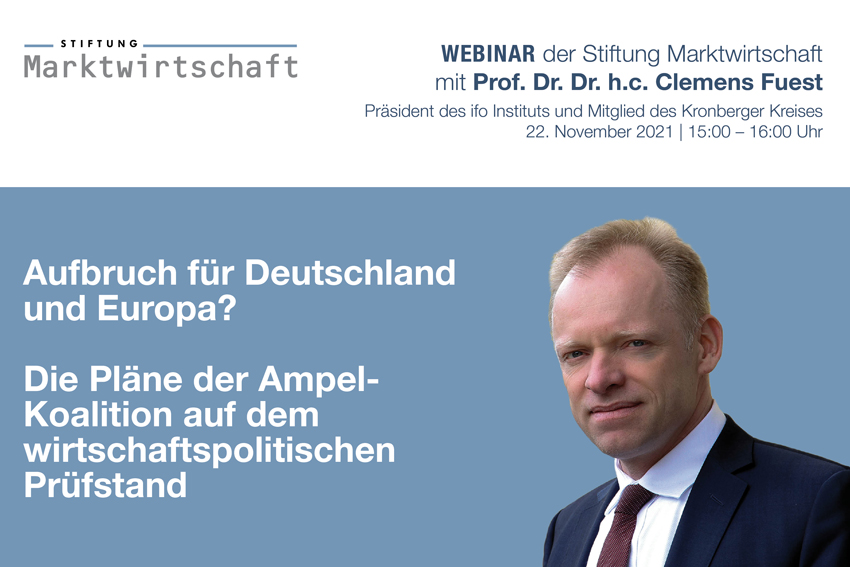 Anlässlich der Koalitionsverhandlungen zwischen SPD, Bündnis 90/Die Grünen und FDP lud die Stiftung Marktwirtschaft zu einem exklusiven Austausch mit dem ifo-Präsidenten Prof. Dr. Dr. h.c. Clemens Fuest, Mitglied des Kronberger Kreises, ein. Im Rahmen des Webinars bewertete Fuest zentrale Bausteine des sich abzeichnenden Koalitionsvertrages und zeigte auf, mit welchen Maßnahmen die neue Bundesregierung die wesentlichen Herausforderungen unserer Zeit bewältigen könnte.