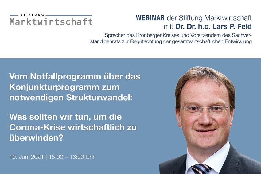 Diese Fragen diskutierte die Stiftung Marktwirtschaft am 10. Juni 2020 im Webinar „Vom Notfallprogramm über das Konjunkturprogramm zum notwendigen Strukturwandel: Was sollten wir tun, um die Corona-Krise wirtschaftlich zu überwinden?“ mit dem Sprecher des Kronberger Kreises und Vorsitzenden des Sachverständigenrates zur Begutachtung der gesamtwirtschaftlichen Entwicklung, Prof. Dr. Dr. h.c. Lars P. Feld.